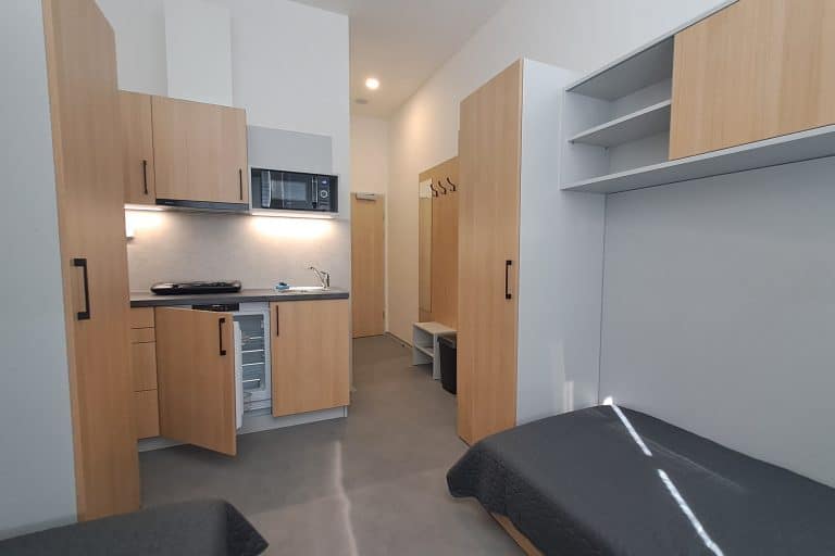 Kartovým dveřním systémem, kuchyňskou linkou se základním vybavením, ledničkou, rychlovarnou konvicí, mikrovlnou troubou, vařičem, nábytkem, sociálním zařízením se sprchovým koutem, free wi-fi a žaluziemi.